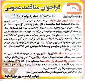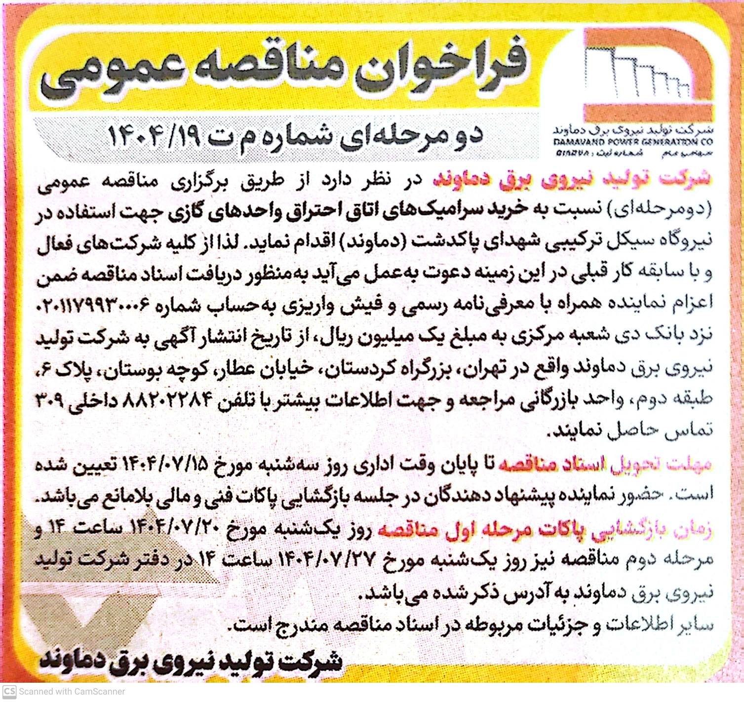 جزییات مناقصه و مزایده مناقصه دو مرحله ای شماره م ت 1404/19 نوع مناقصه دو مرحله ای شماره 1404/19 سازمان مرکزی شرکت تولید نیروی برق دماوند سازمان برگزار کننده شرکت تولید نیروی برق دماوند توضیح مختصر خرید سرامیک های اتاق احتراق واحدهای گازی قیمت پیوست 0 تومان وضعیت انقضا منقضی شده اطلاعات تکمیلی مهلت ارسال اسناد ۱۵ مهر ۱۴۰۴ ۱۶:۰۰ تاریخ درج آگهی در روزنامه ۲۹ شهریور ۱۴۰۴ واحدپولی برآورد مالی ریال محدوده داخلی وضعیت برگزاری عادی مبلغ تضمین 330,000,000 تومان این مناقصه دو مرحله ای قابل تمدید است. اطلاعات اسناد مهلت دریافت سند ۱۵ مهر ۱۴۰۴ ۱۶:۰۰ تاریخ اتمام فروش اسناد ۱۵ مهر ۱۴۰۴ ۱۶:۰۰ قیمت اسناد 1,000,000 ریال محل دریافت اسناد استان: تهران, شهر: تهران بزرگ بزرگ راه کردستان -خیابان عطار -کوچه بوستان -پلاک 6 -طبقه دوم اطلاعات شخص پاسخگو تلفن 309 توضیحات ( شماره حساب :0201179930006 و شماره کارت :5029387010039409 جهت واریز هزینه خرید اسنادشرکت تولید نیروی برق دماوند ) اطلاعات پیوست تاریخ دریافت اسناد پایان یافته است.